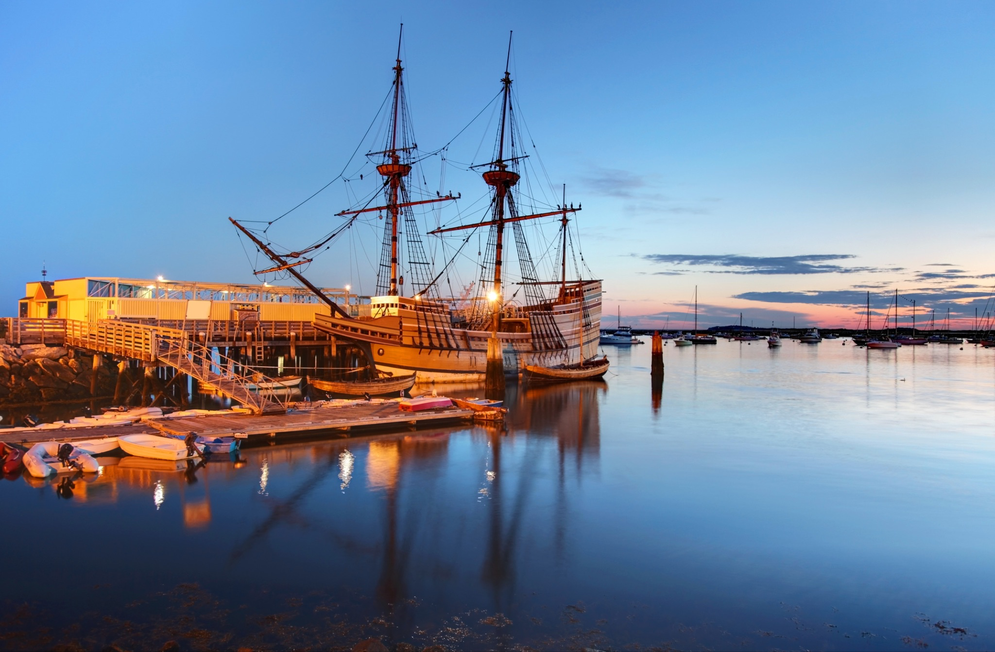 The Mayflower II and the Mayflower Meetinghouse – The Mayflower 2 was built in England to be a replica of the original 17th century ship that transported the Pilgrims here. The ship is a working vessel and floating classroom, allowing visitors an up-close view of the conditions and journey of the Pilgrims across the Atlantic. The nearby Mayflower meetinghouse stores records from the original Pilgrims and their ancestors, and is currently the 5th structure in this location.