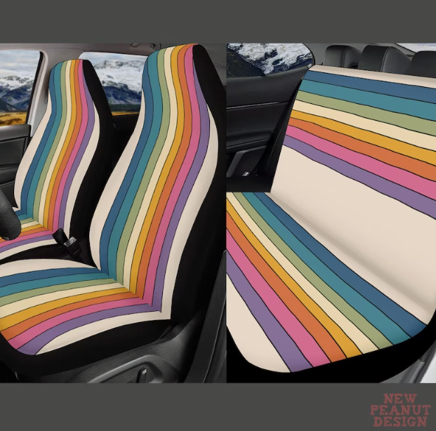 How about adding a little blast from the past with these retro inspired bucket seat and front seat car seat covers! They’re a fun, tropical, summery rainbow shade and perfect to keep your seats protected and cool from your road trip adventures. Sold for $50+ on Etsy from NewPeanutDesign.