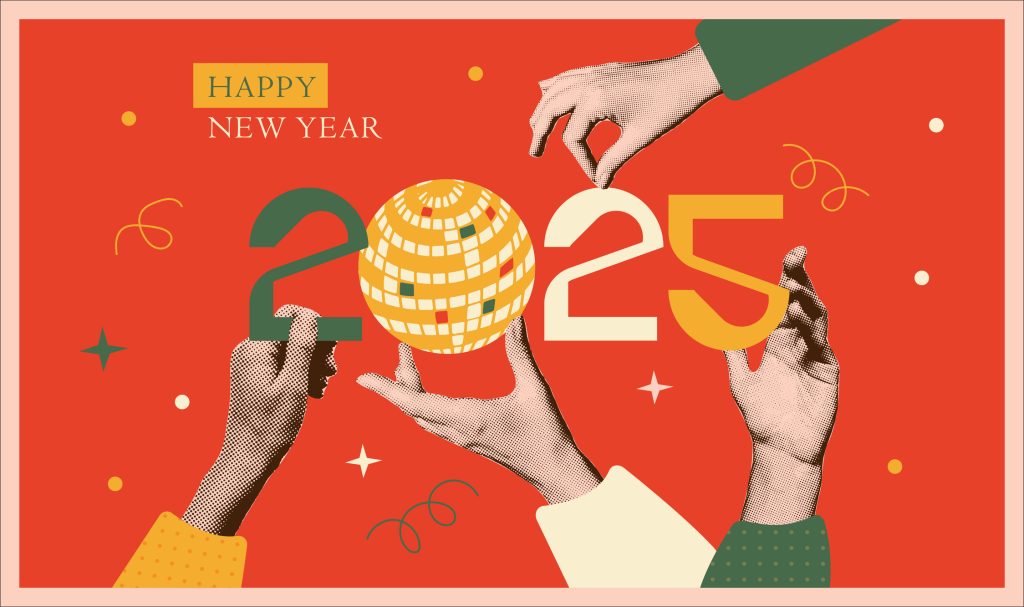 2025 New year art collage banner with halftone hands holding disco ball and cut out numbers. Trendy muted retro vector illustration.